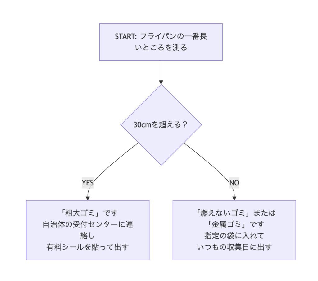 結論から言うと、フライパンの捨て方は「一番長い部分が30cmを超えるかどうか」でほぼ決まります。